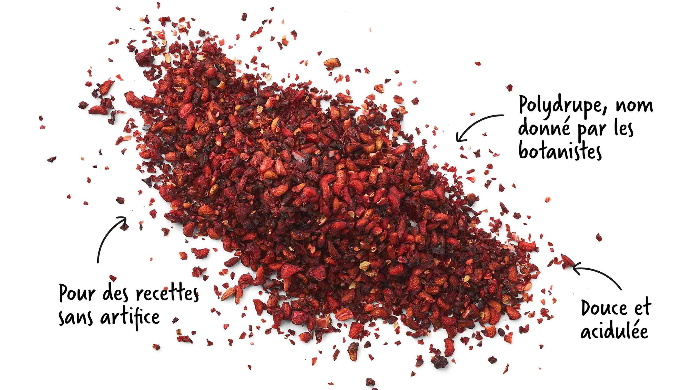 Nos maîtres infuseurs travaillent des morceaux de framboise séchés pour qu'ils expriment toute leur fraîcheur et leur acidité dans nos recettes sans jamais d’arômes ajoutés.