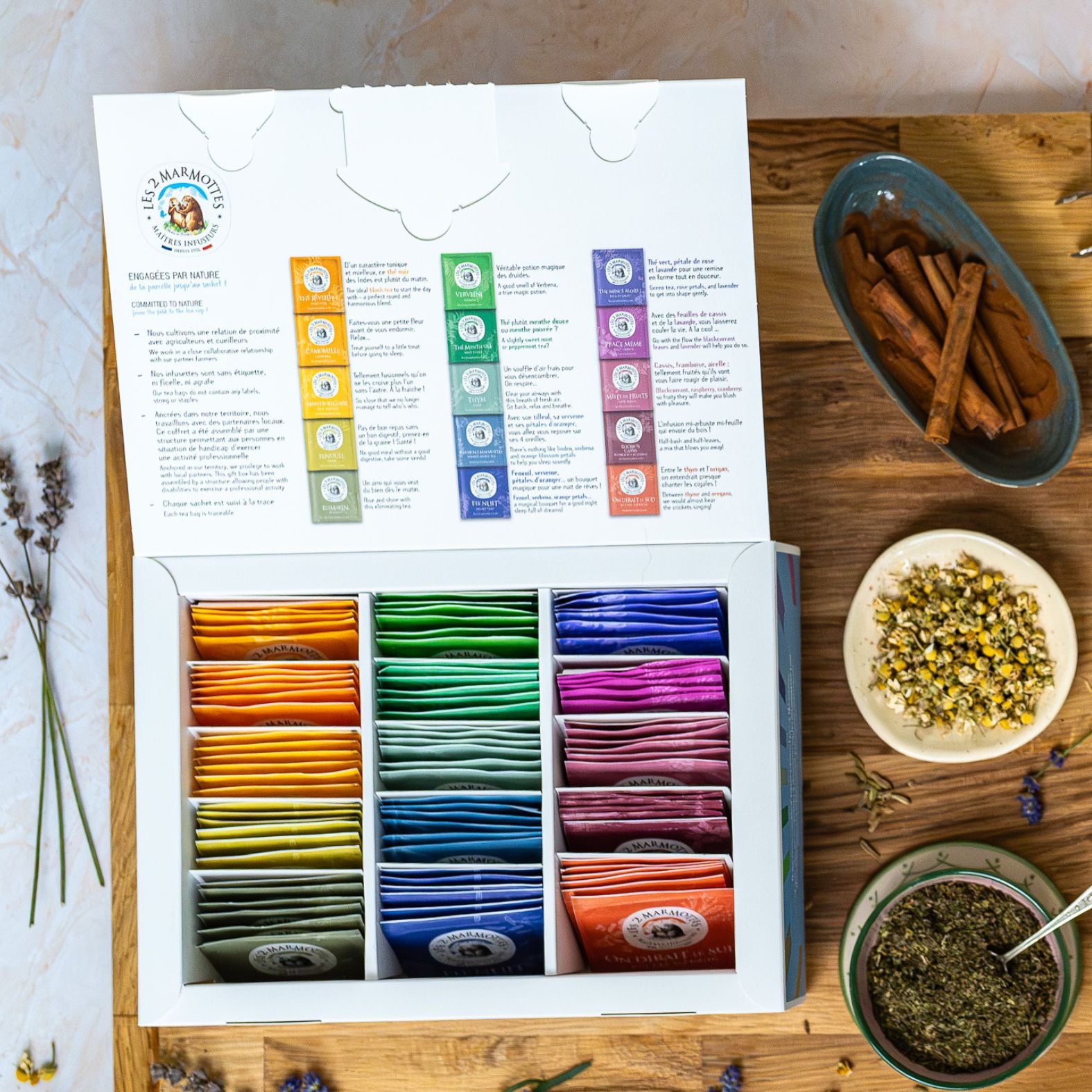 Avec cet assortiment de 15 infusions et thés, vous allez pouvoir découvrir une large gamme de nos recettes sans un poil d’arômes ajoutés. Nos marmottes sont parties récolter les meilleures plantes, auprès de producteurs passionnés, pour vous concocter ce joli coffret. Faites voyager vos papilles à travers champ !