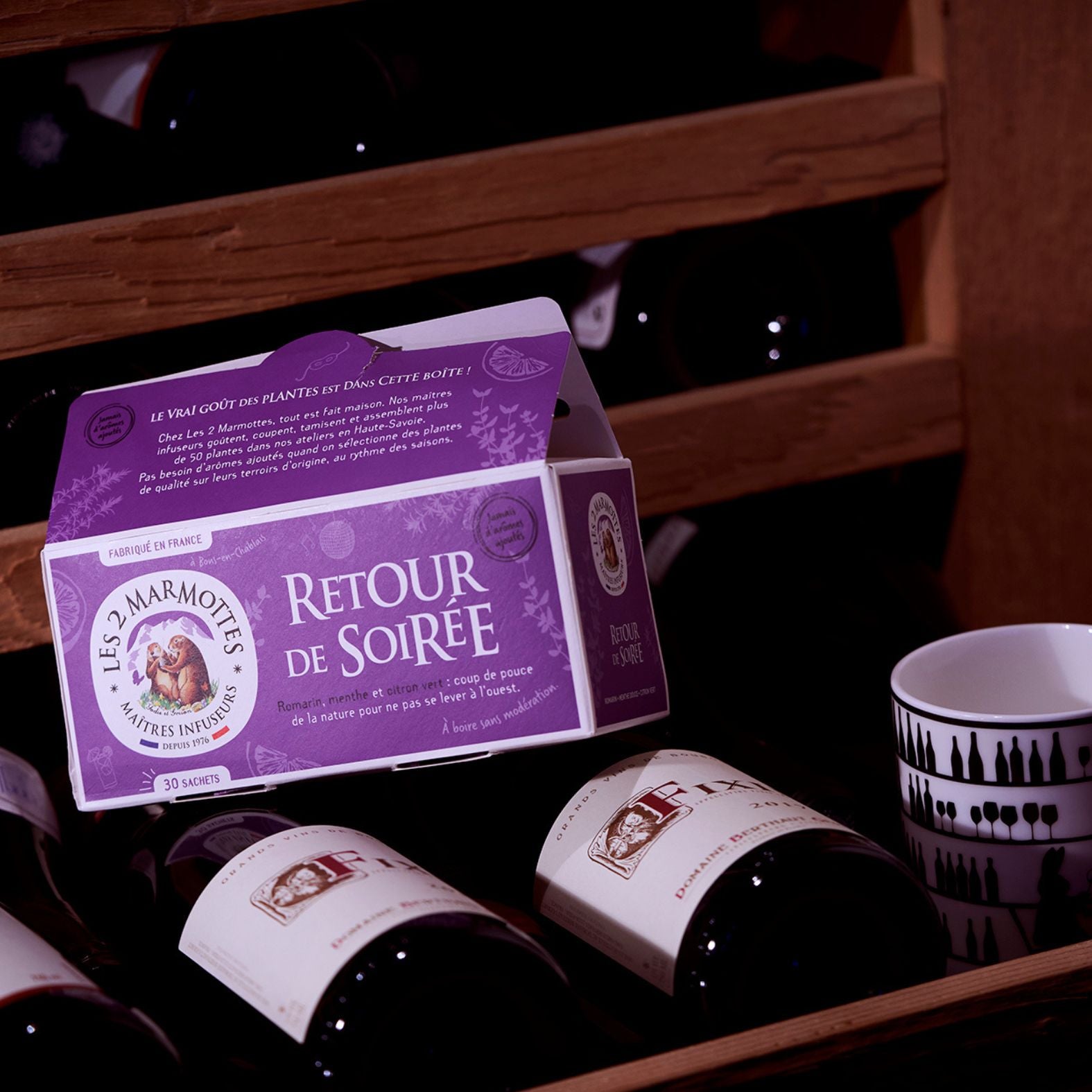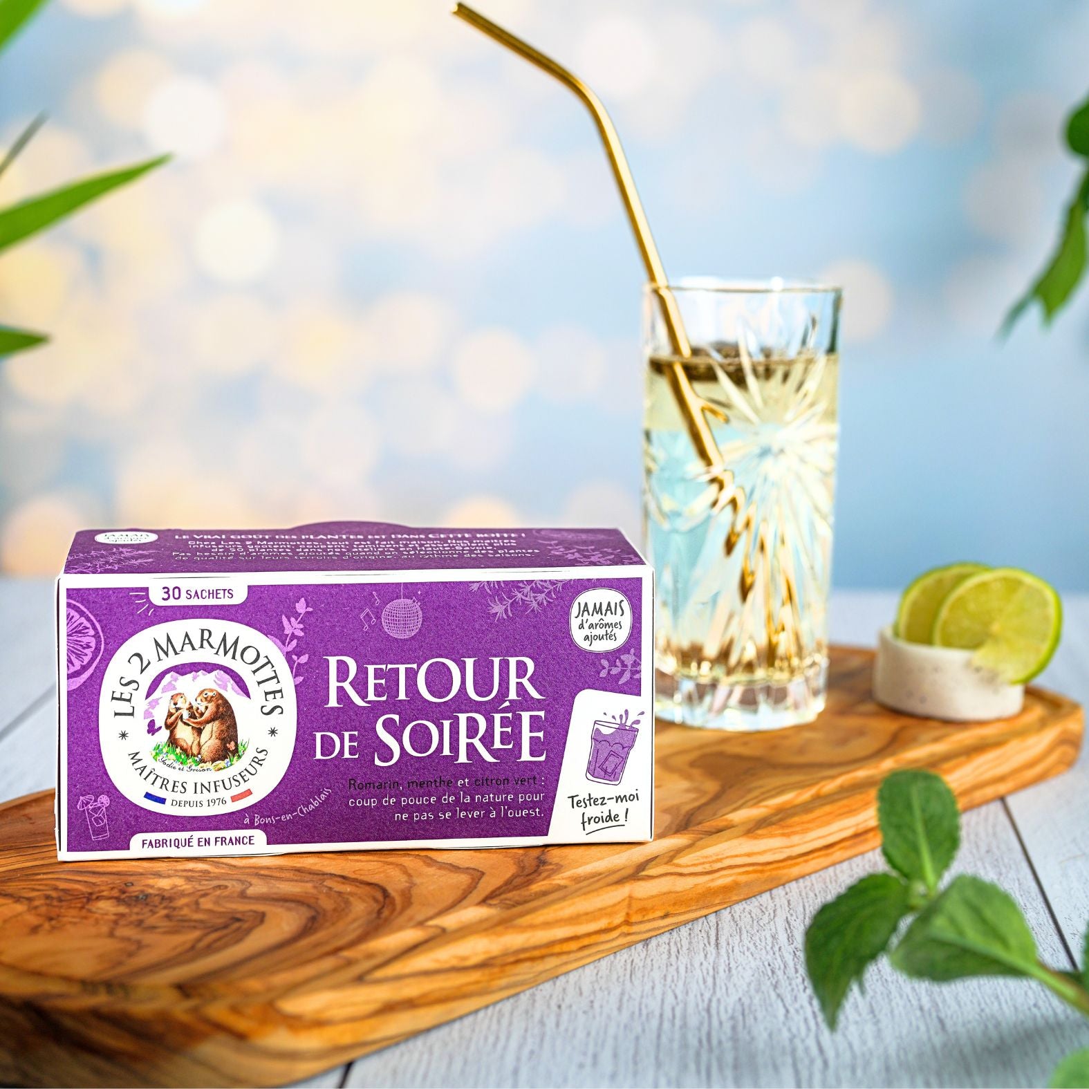 Having recovered from their emotions, they came up with the idea of this organic mint and rosemary herbal tea to help you land and gently pick yourself up after a night of excess! A 100% plant-based cocktail with mint bringing back its strawberry and healthy freshness. Rosemary, its woody and invigorating scent. Lime, its hint of invigorating acidity. In the end, an organic herbal tea to help you sleep without counting sheep.