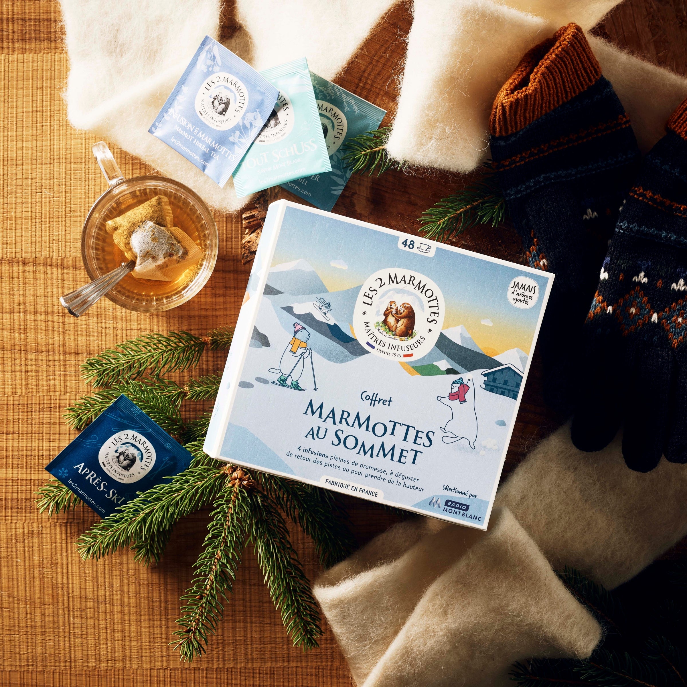 Découvrez notre coffret « Marmottes au Sommet », 100% plantes, sans arômes ajoutés, fabriqué en Haute-Savoie par nos maîtres infuseurs : 4 infusions spéciales montagne à déguster tout schuss !
