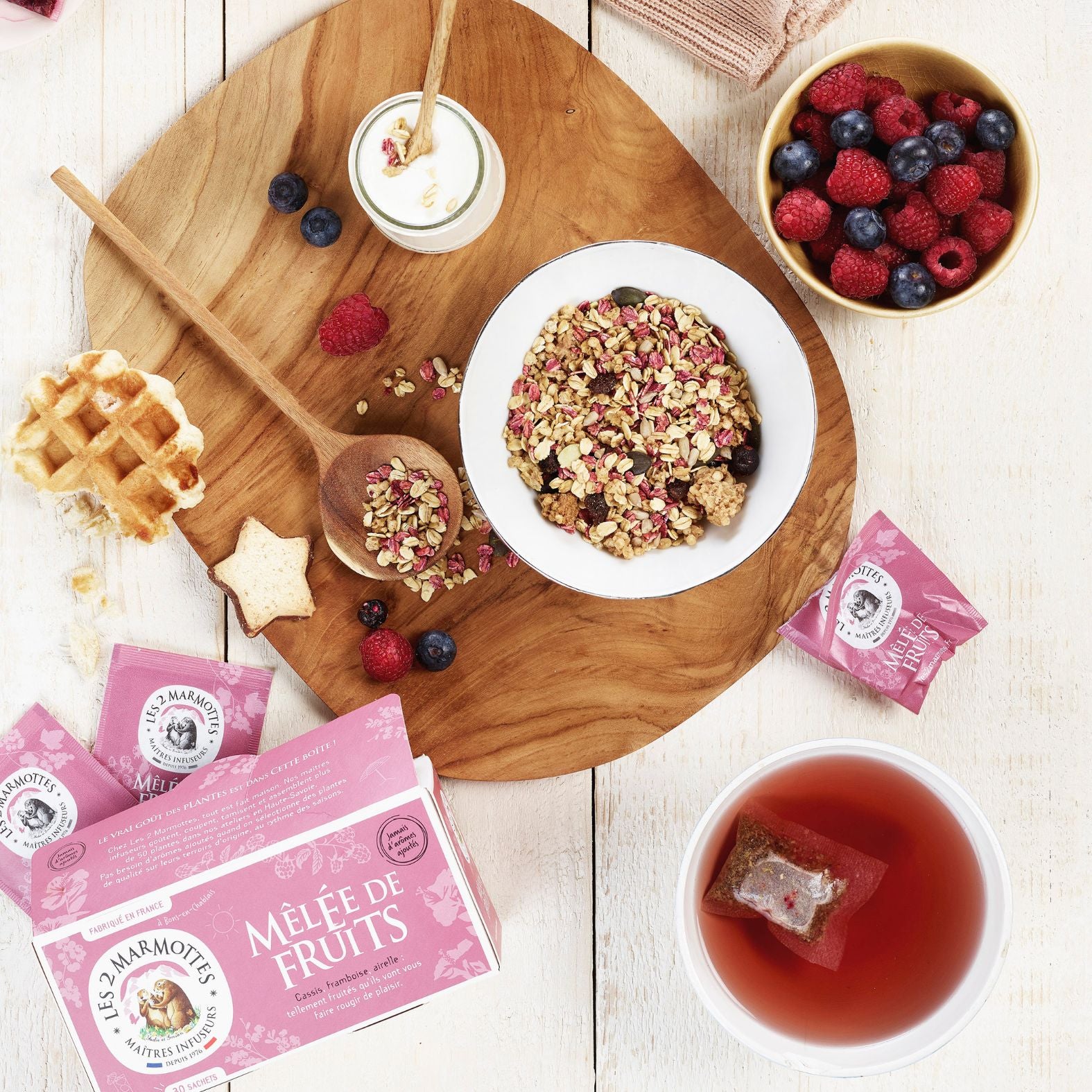 Un jour d’été, nos maîtres infuseurs ont eu envie de la saveur gourmande des fruits rouges. lls ont relevé le défi d'une recette fruitée sans aucun arôme ajouté ! Cassis, framboise et airelle apportent une délicieuse acidité, et les fleurs d'hibiscus cette belle couleur rouge. Mission accomplie !